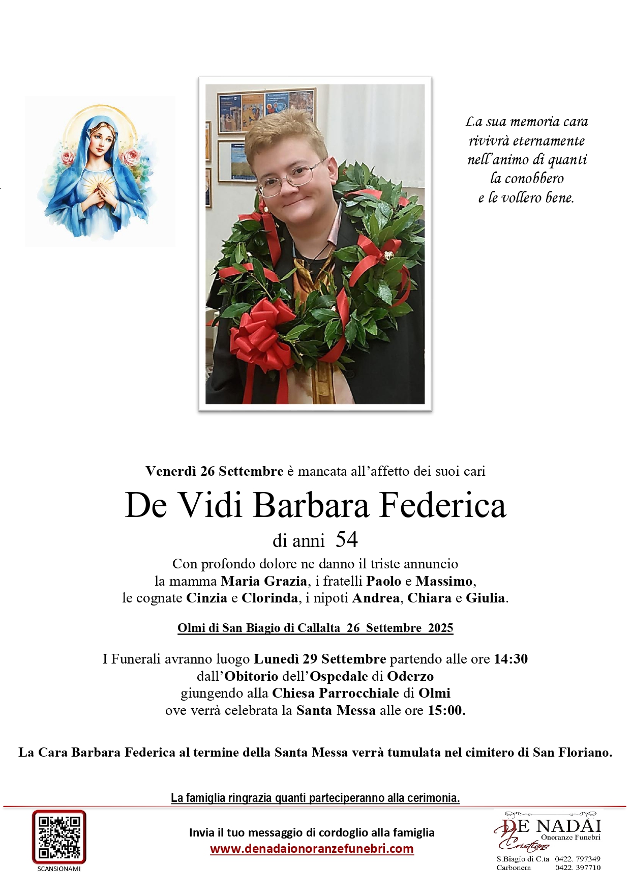 Con grande dolore comunichiamo che oggi, 26 settembre è mancata Barbara De Vidi, ex studentessa del nostro ISSR “Giovanni Paolo I”.