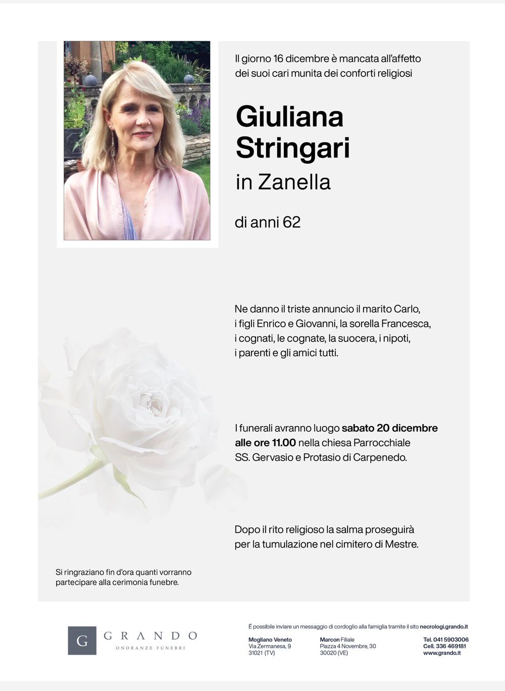 Le esequie si svolgeranno nella Chiesa parrocchiale SS. Gervasio e Protasio di Carpenedo (VE), sabato 20 dicembre alle ore 11.00.